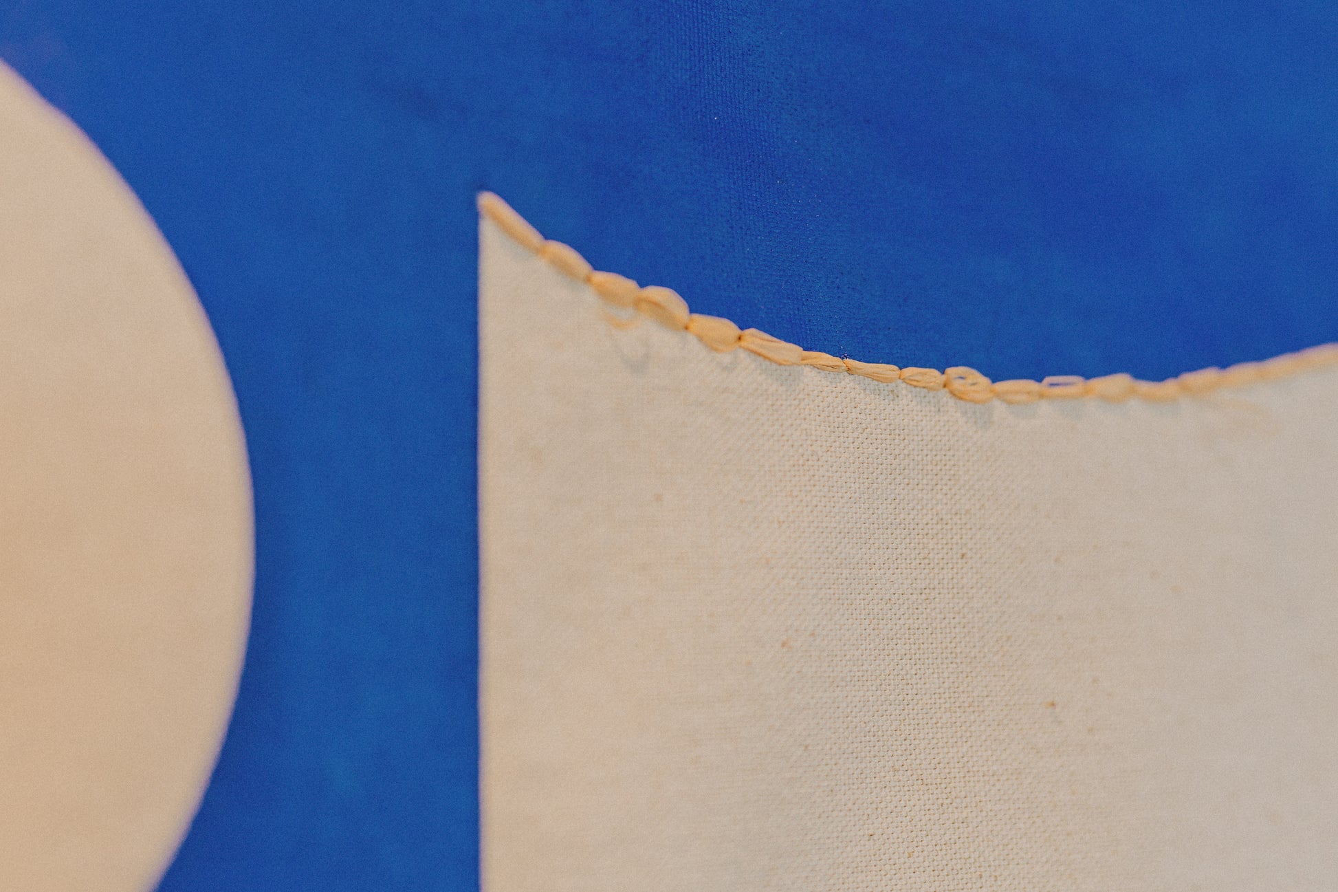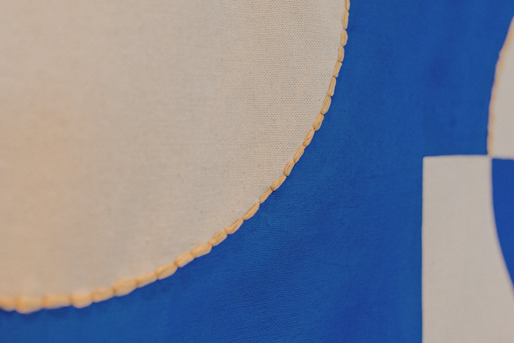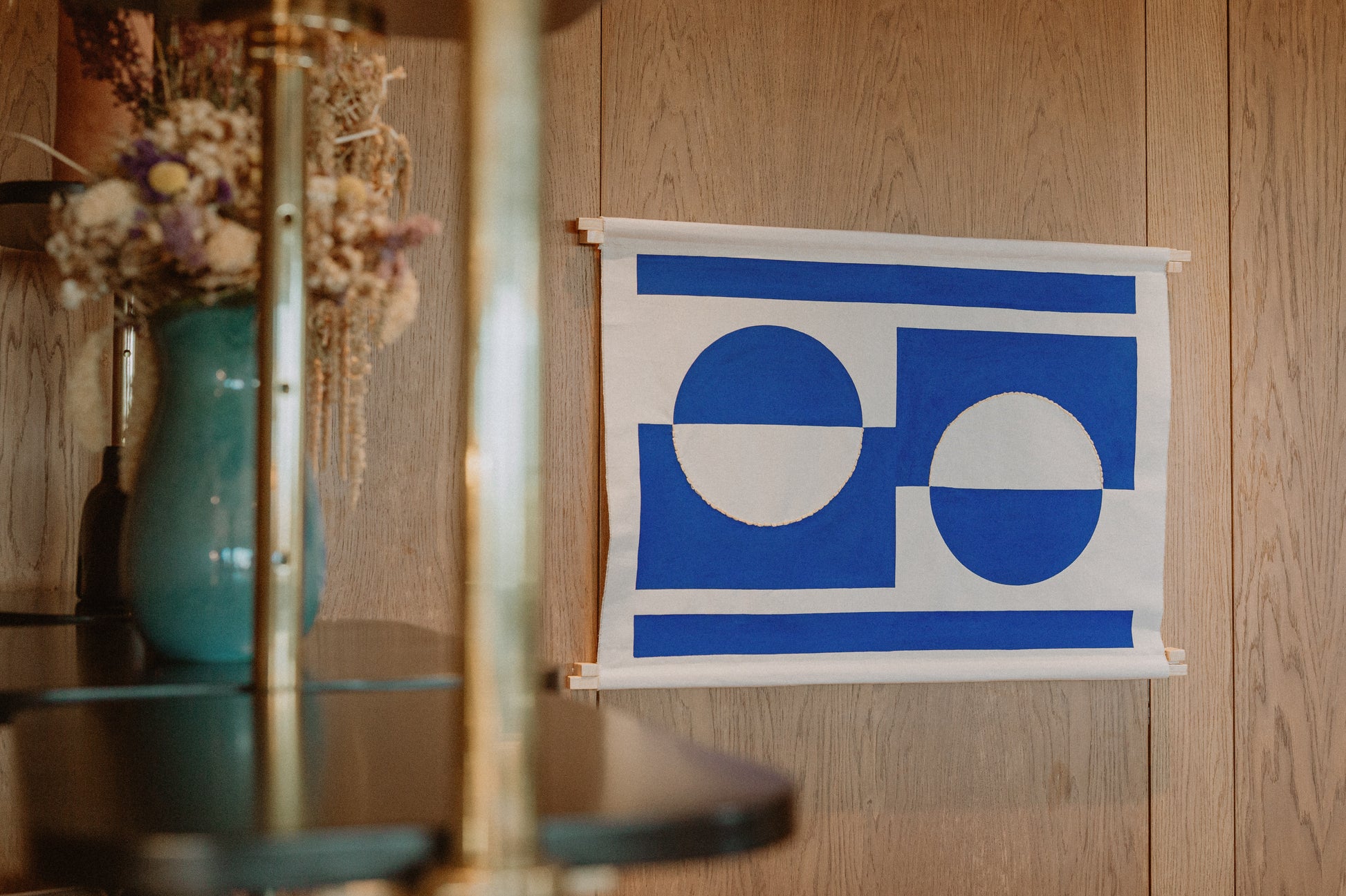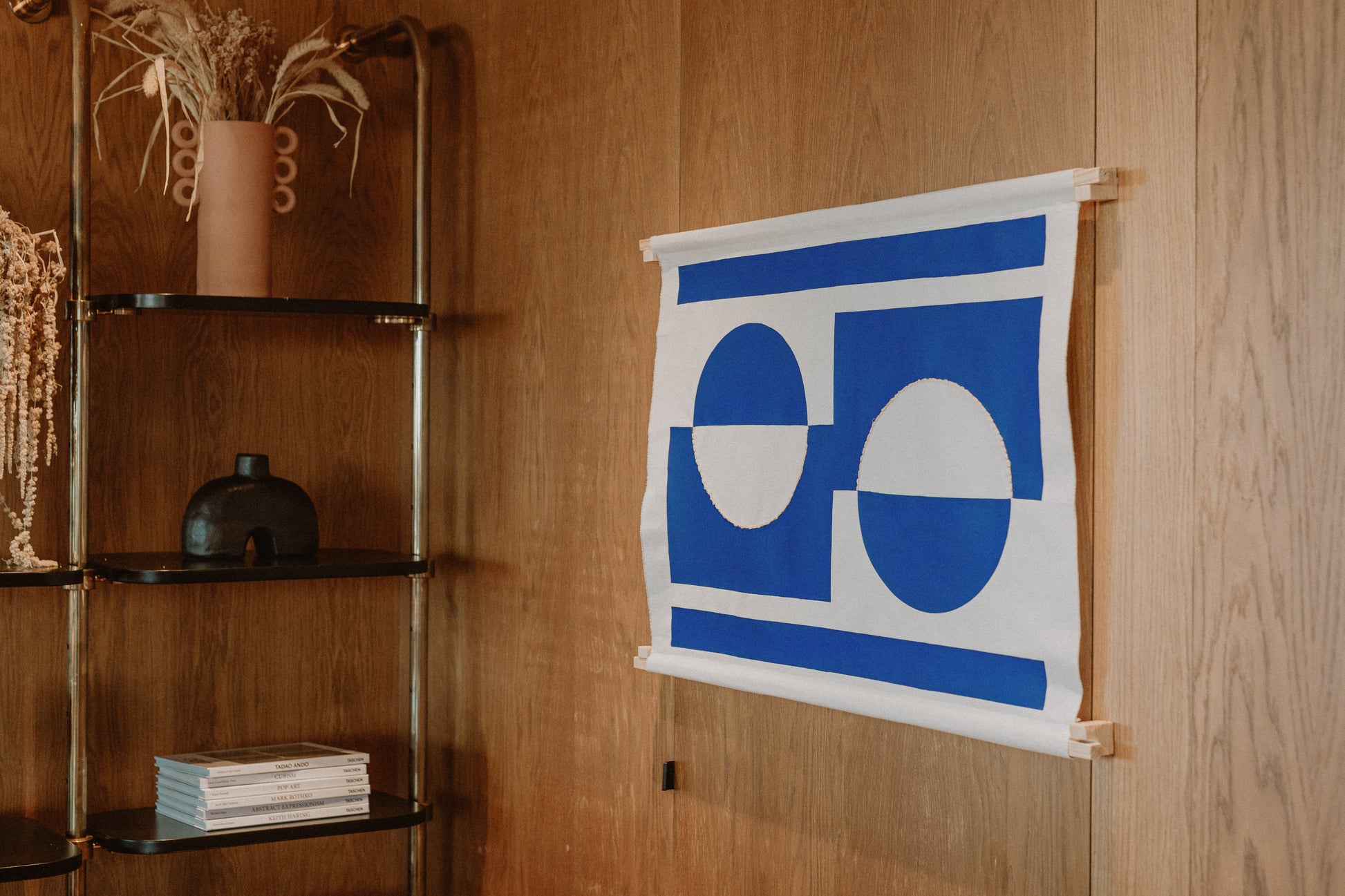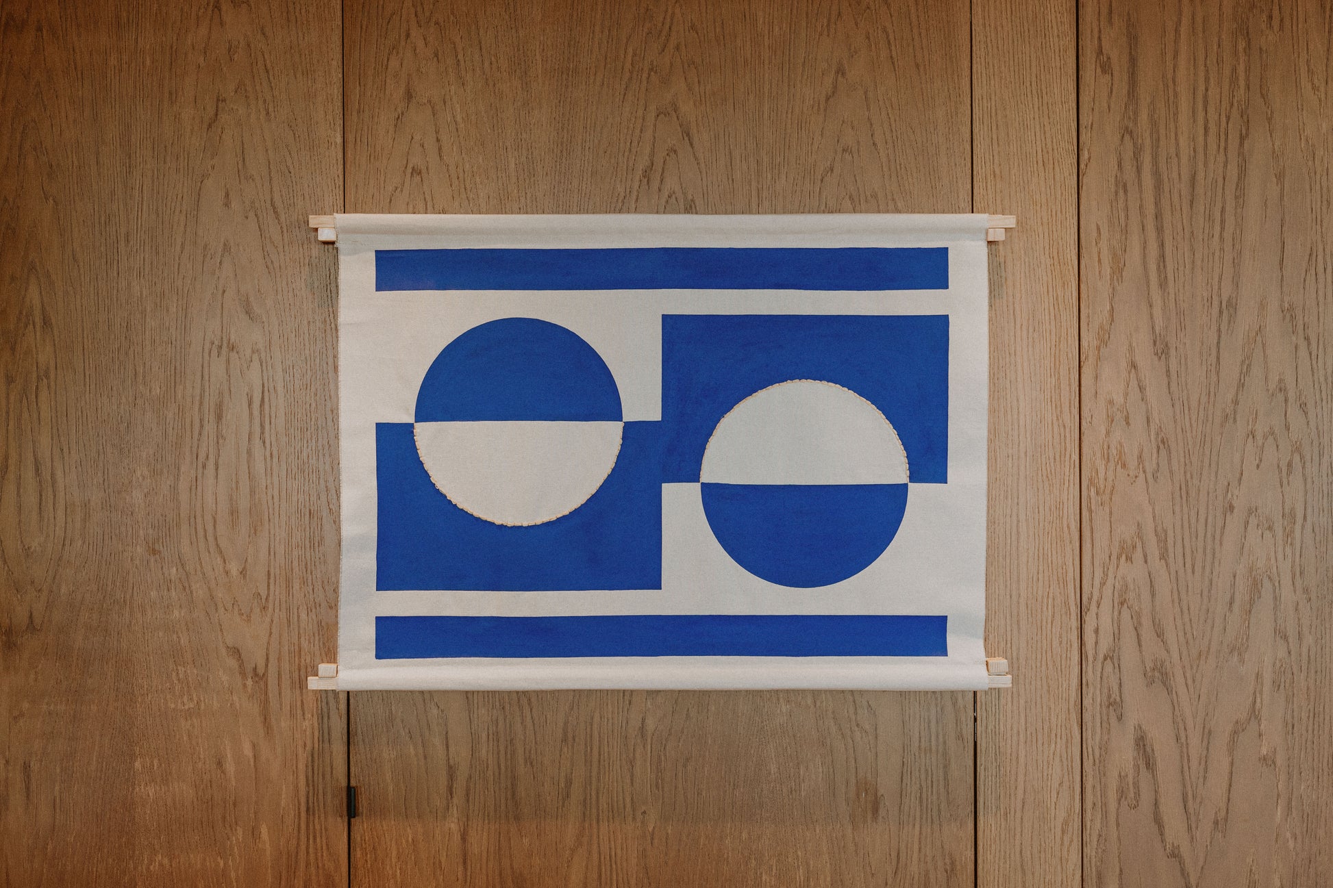 A conversation between form and reflection, Duality explores the meeting point between opposites: light and shadow, stillness and movement, fullness and void. The bold geometry in ultramarine blue unfolds across a field of calm white, creating a visual rhythm that feels both structured and free.