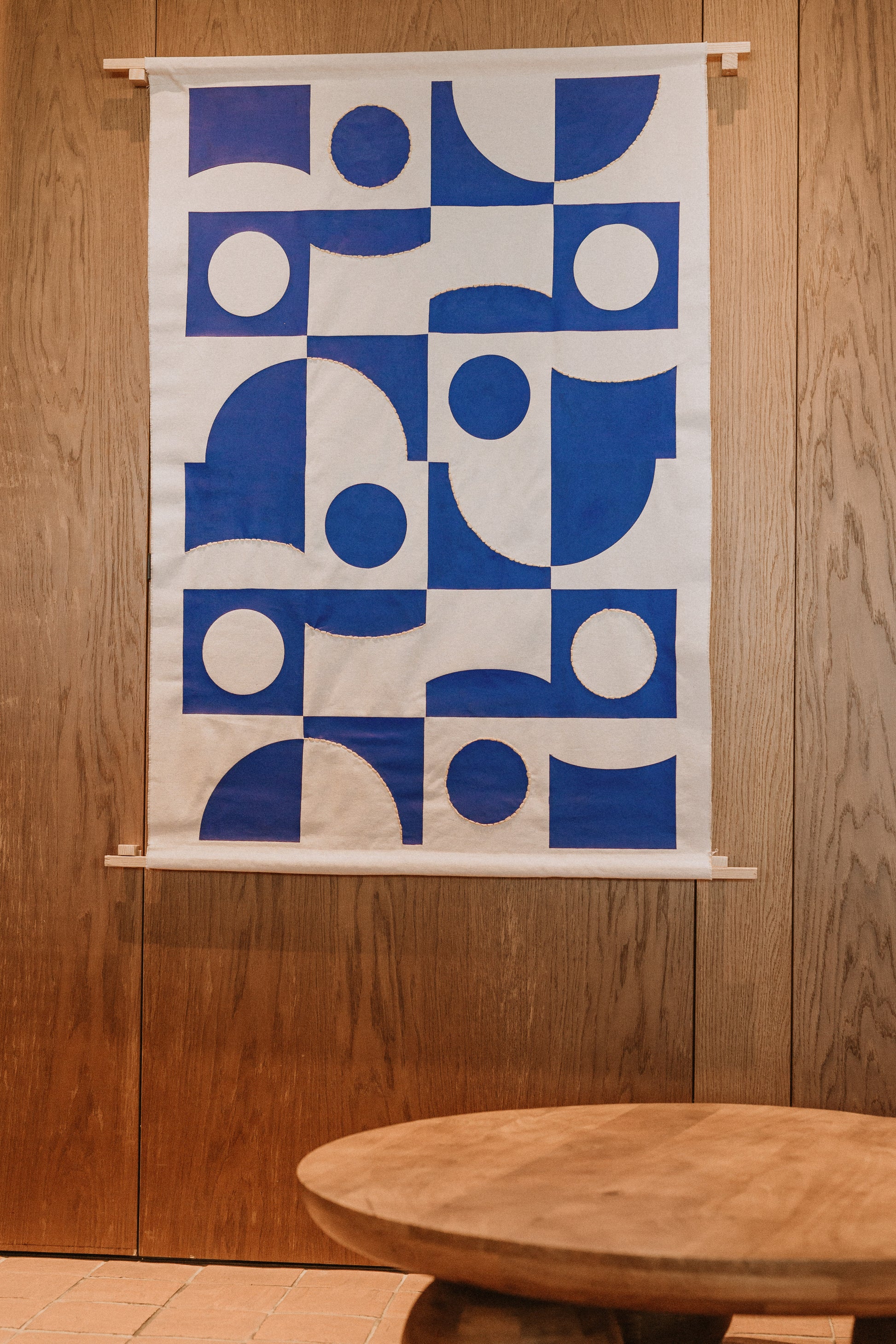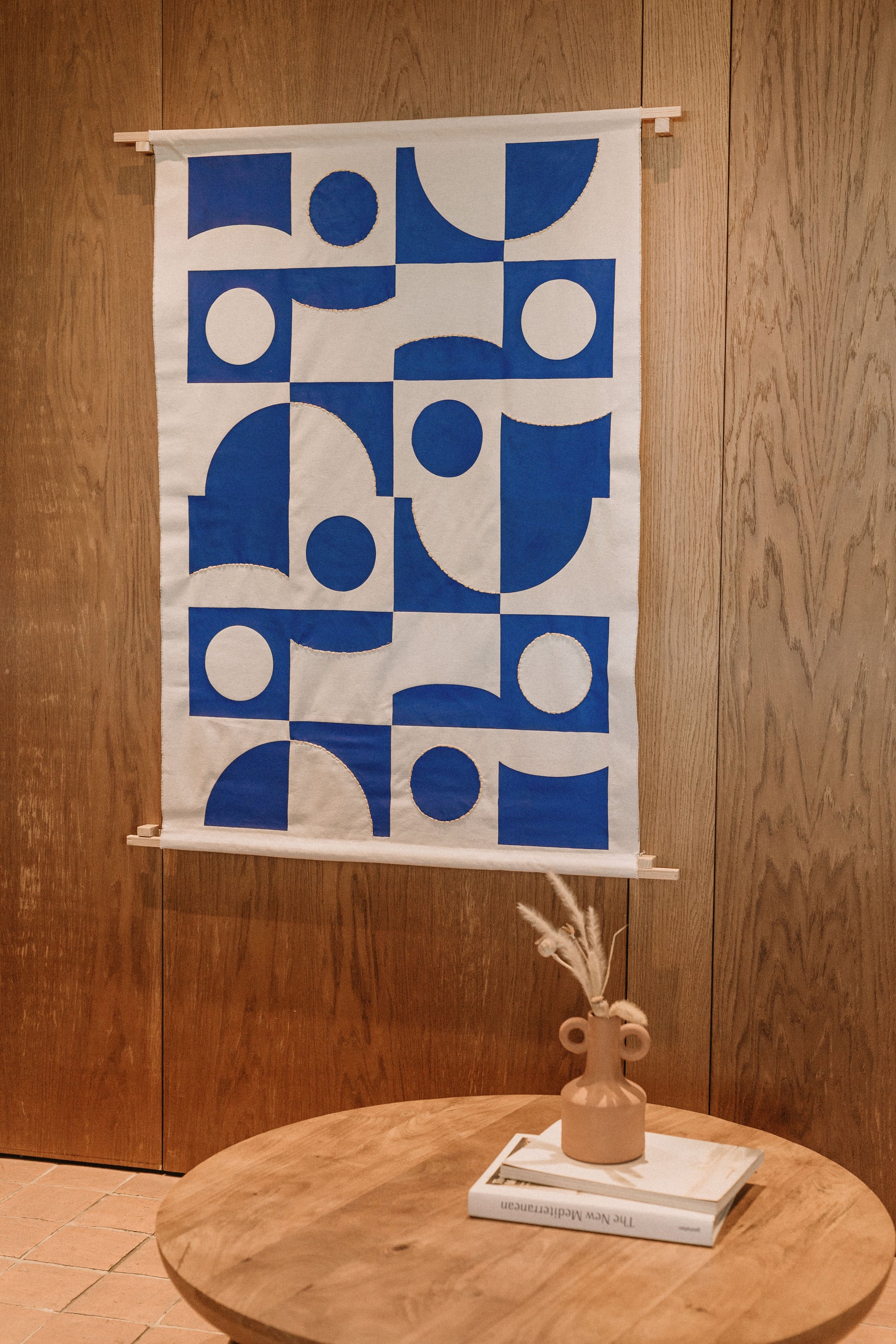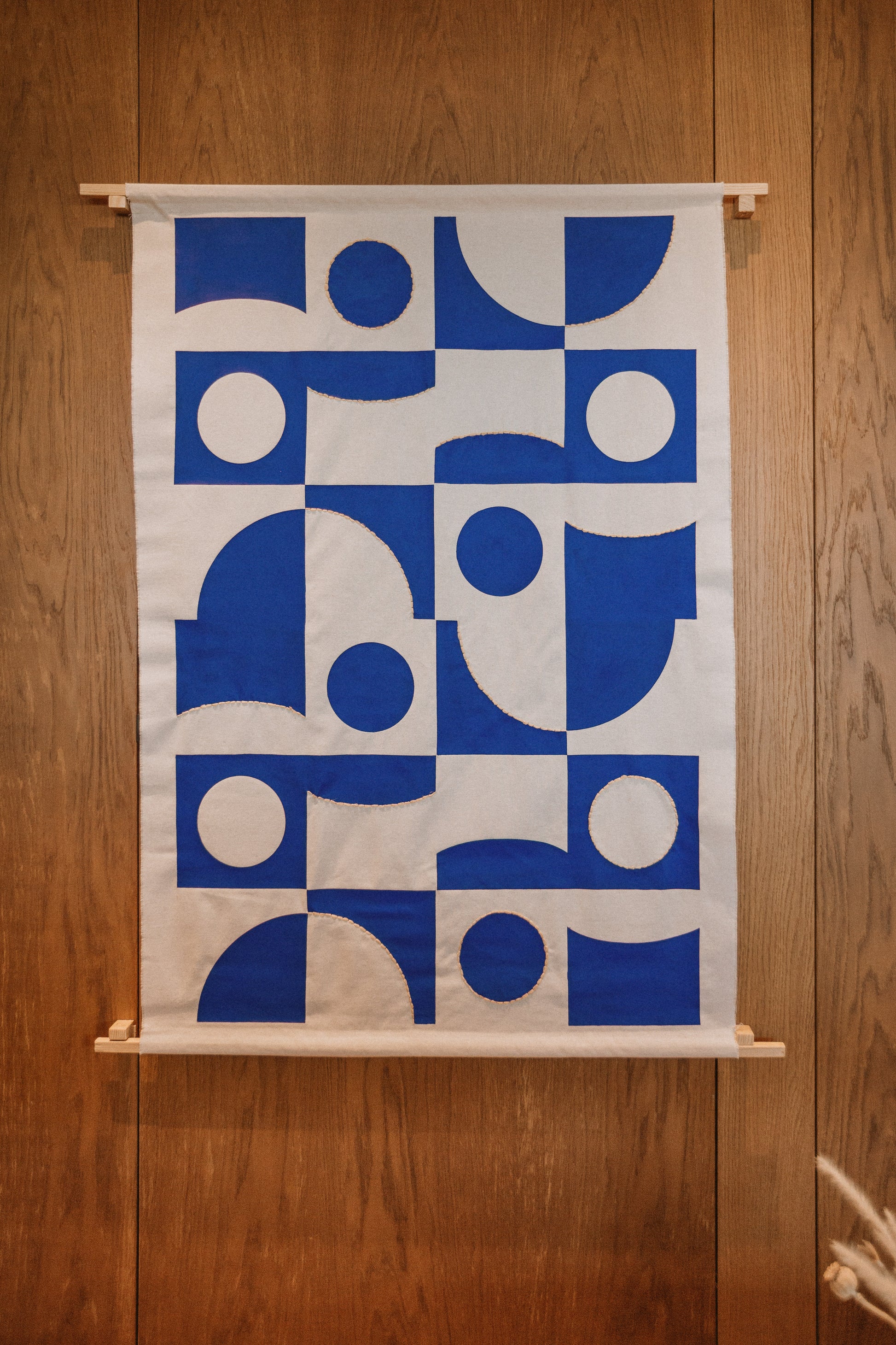 The composition invites the eye to wander — to trace the balance between repetition and variation, structure and play. Subtle imperfections in the hand-painted edges soften the geometry, turning precision into something human, alive, and quietly expressive.