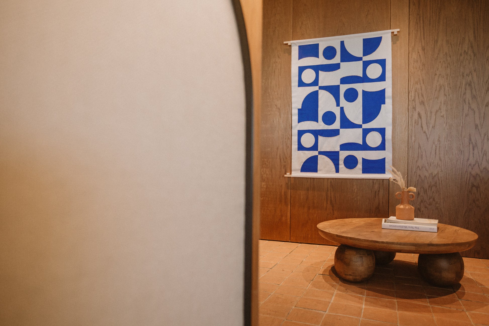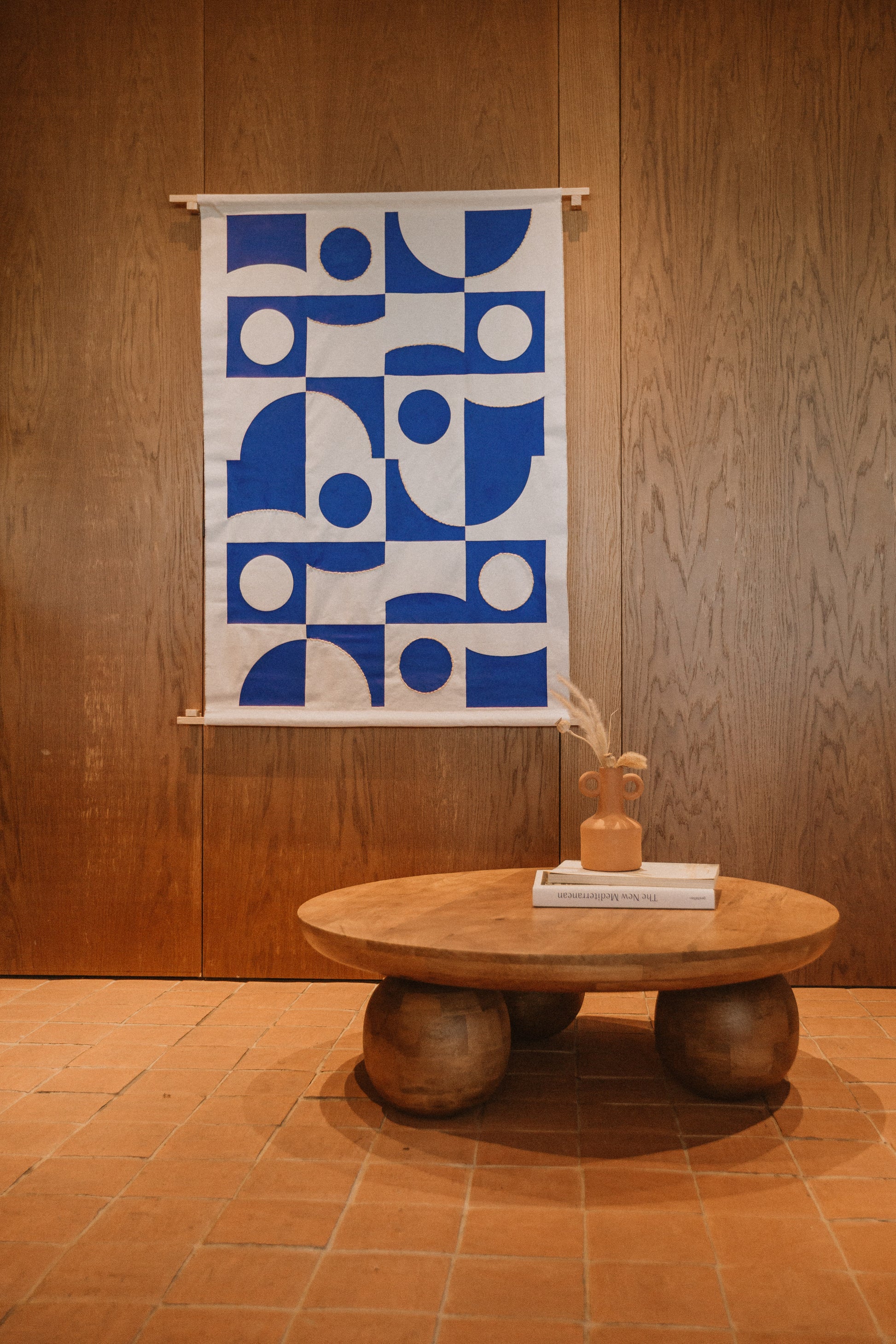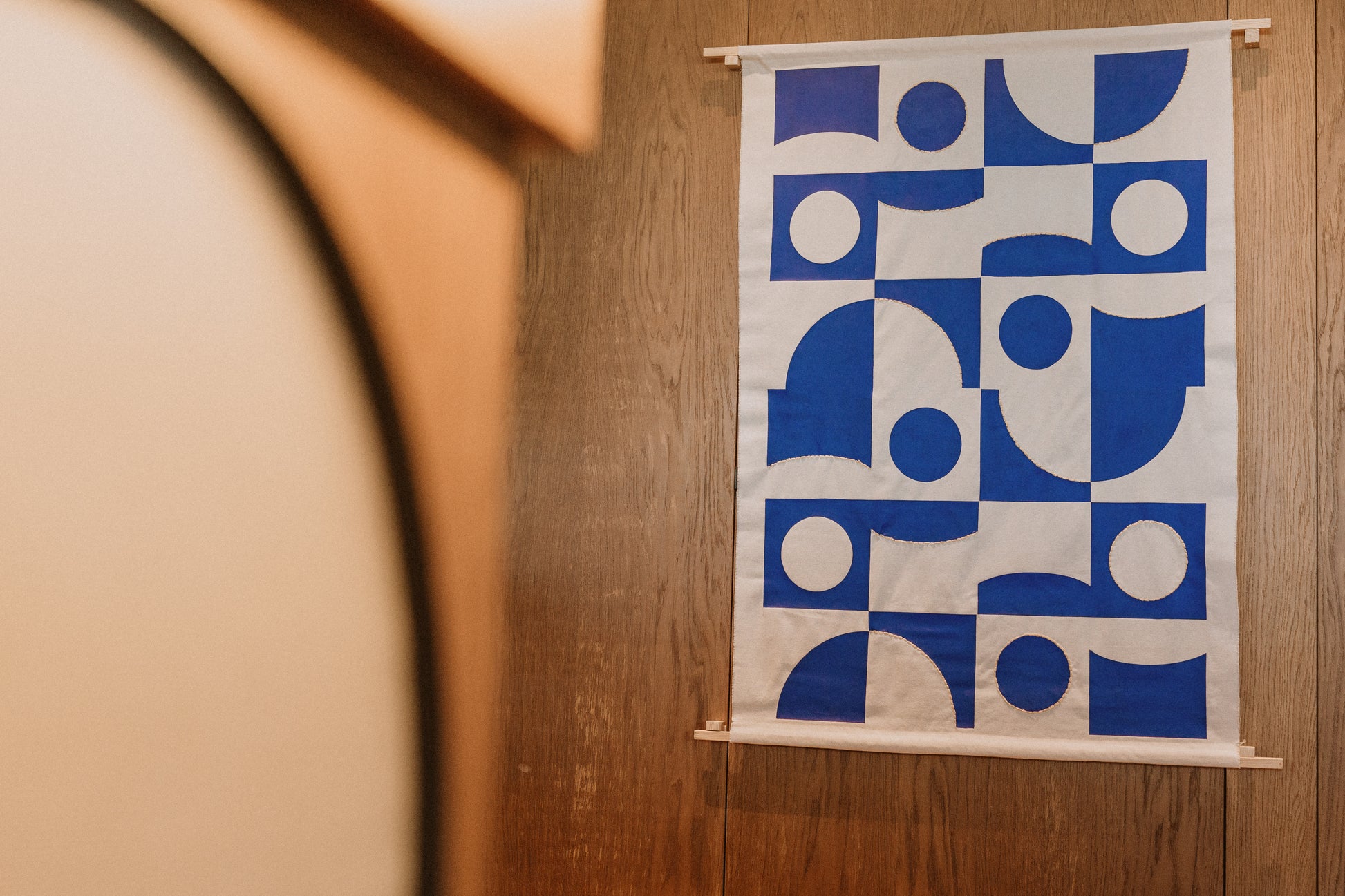 The composition invites the eye to wander — to trace the balance between repetition and variation, structure and play. Subtle imperfections in the hand-painted edges soften the geometry, turning precision into something human, alive, and quietly expressive.