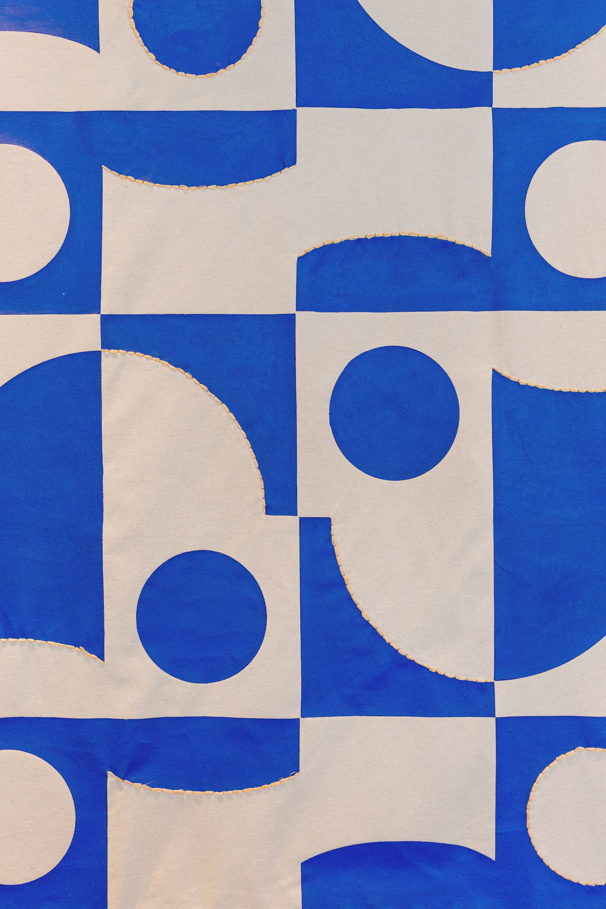 Circles and arches shift across a grid of deep ultramarine and white, creating a visual choreography where form seems to move within stillness.