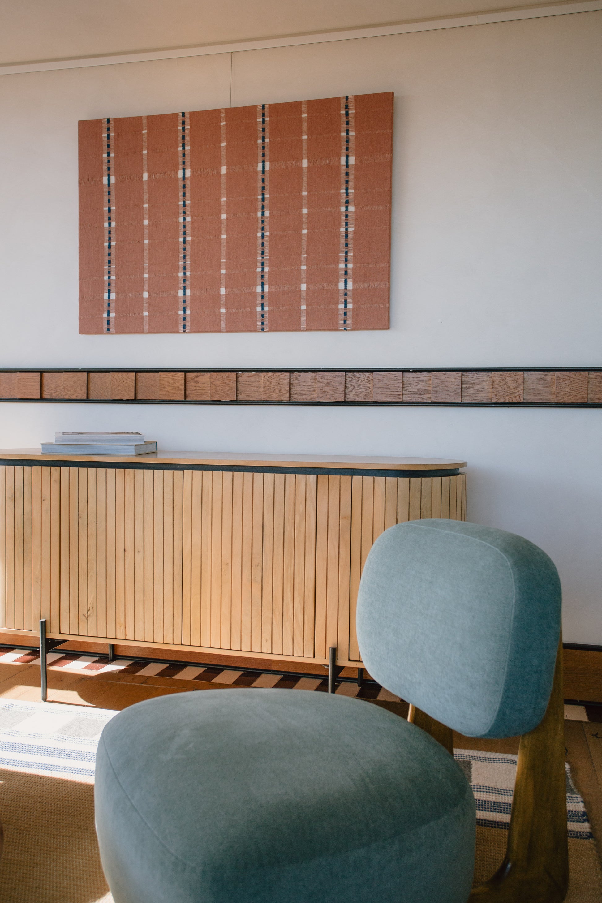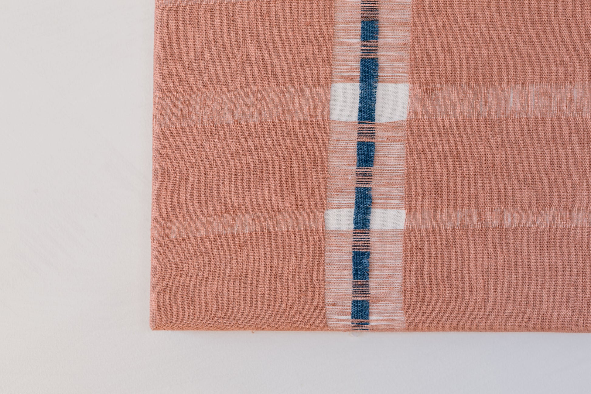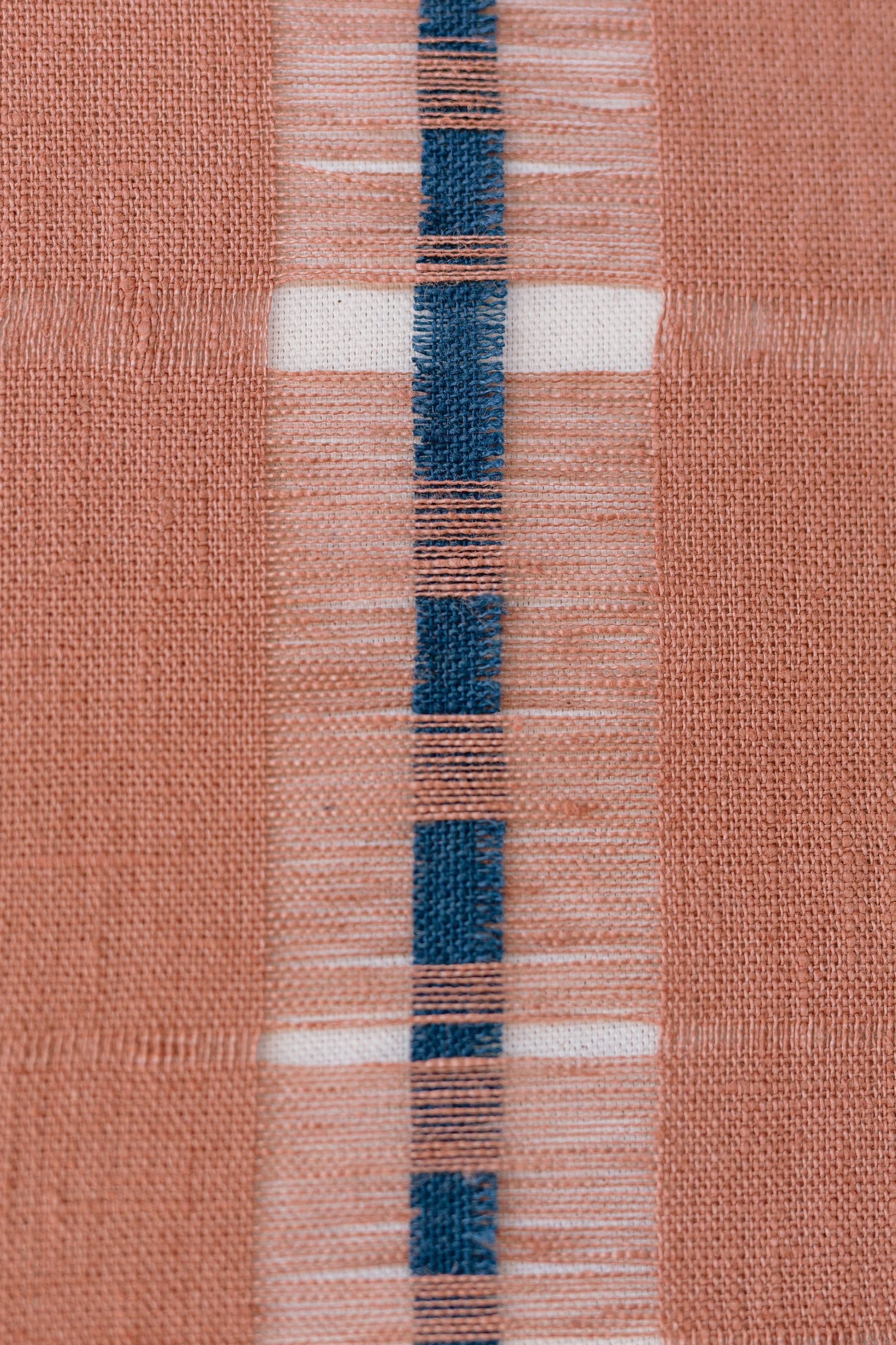 A meditation on emergence, Line of Becoming captures the rhythm of transformation through simplicity and precision. Soft terracotta tones are intersected by threads of indigo and white, creating a quiet pulse across the woven surface, a visual echo of breath, heartbeat, and growth.
